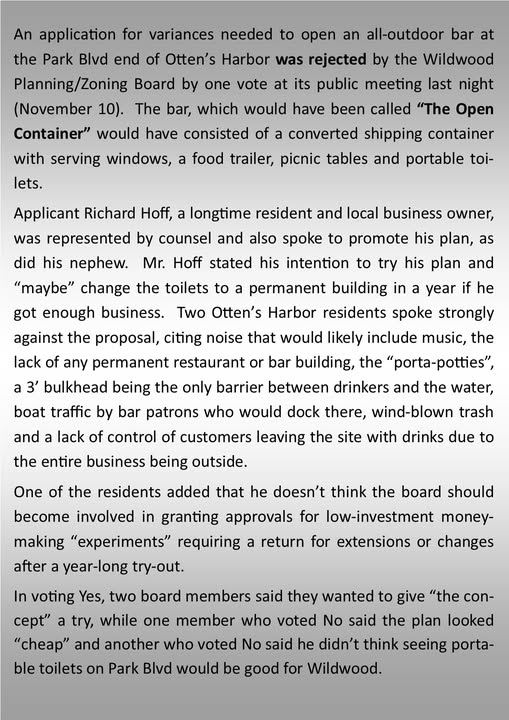 A bold idea to bring an all-outdoor bar to the edge of Ottens Harbor was shut down by a single vote at the November 10th Wildwood Planning/Zoning Board meeting. The proposed venue—dubbed The Open Container—would’ve featured a converted shipping container bar, food trailer, picnic tables, and porta-potties.