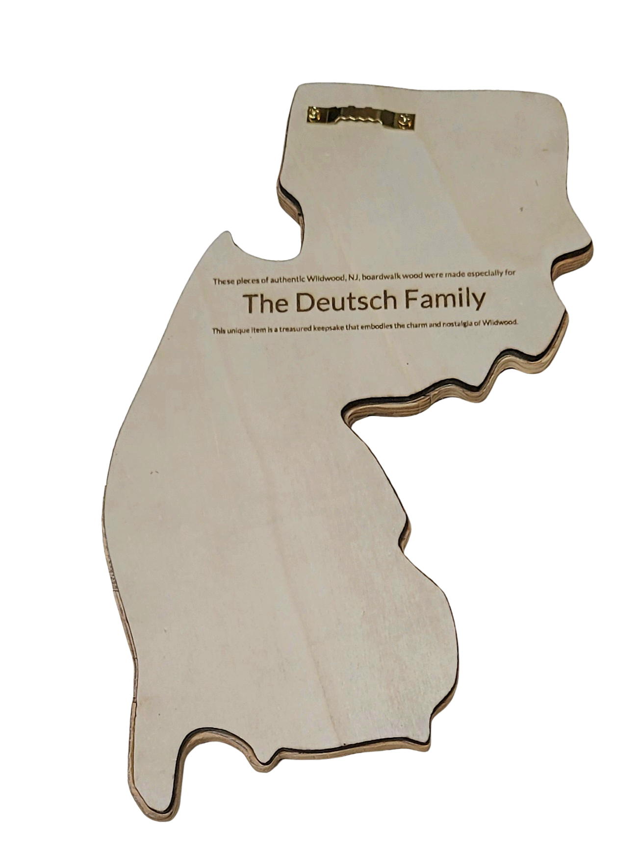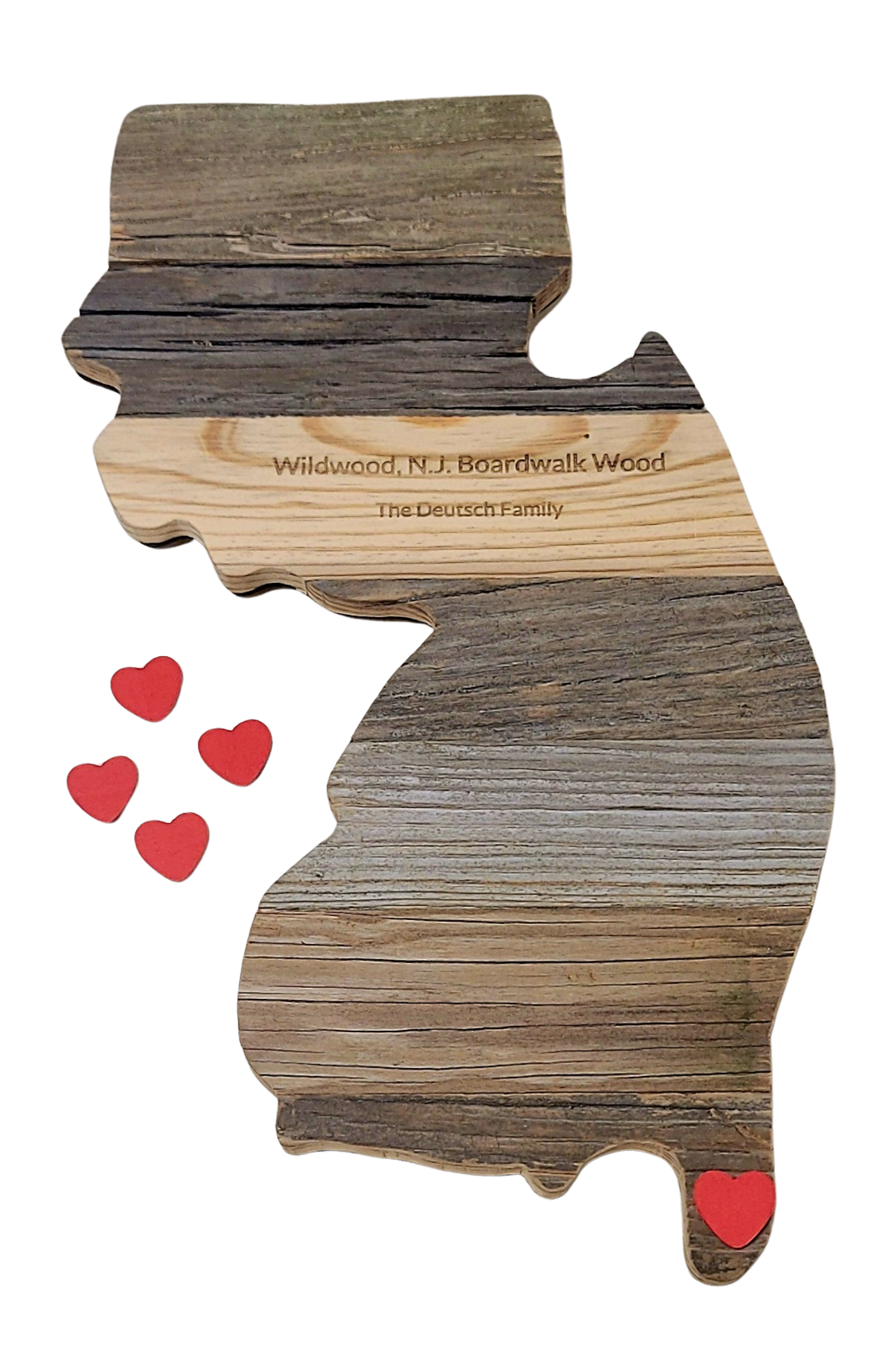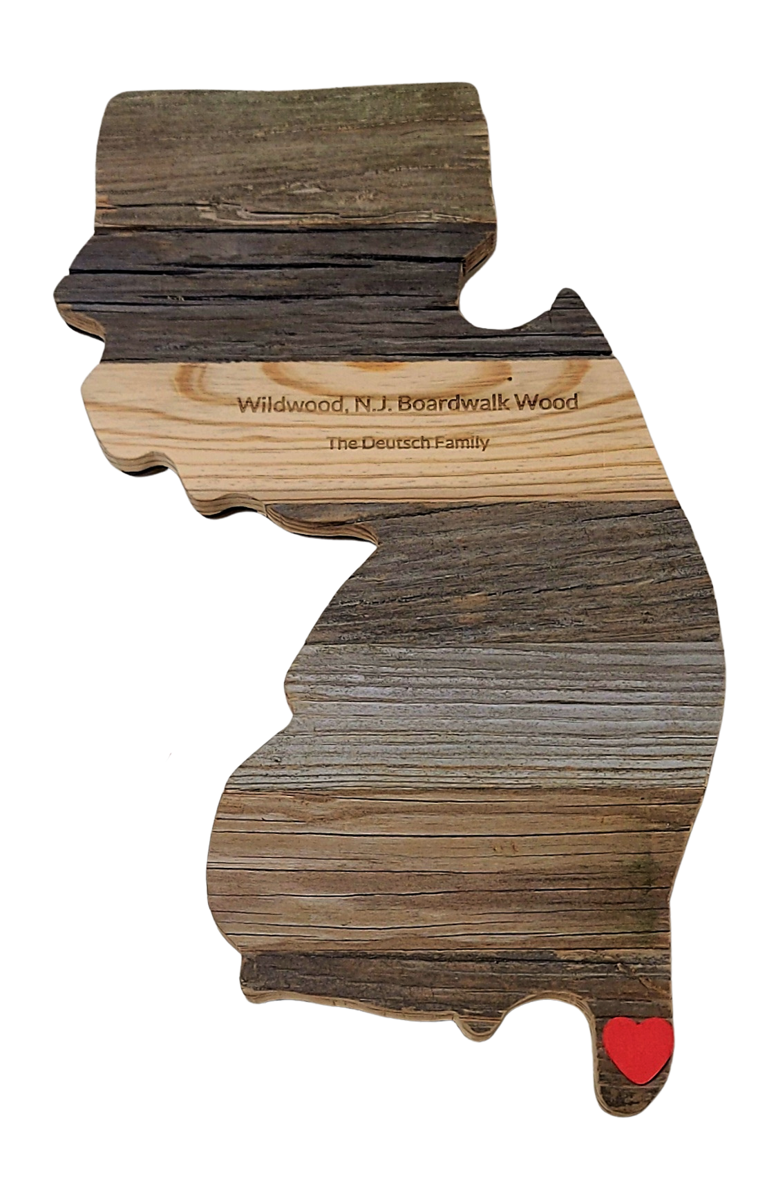 Celebrate your Jersey pride with this handcrafted New Jersey state outline, made from authentic reclaimed Wildwood Boardwalk wood—a piece of shore history you can hang, gift, or display with love.