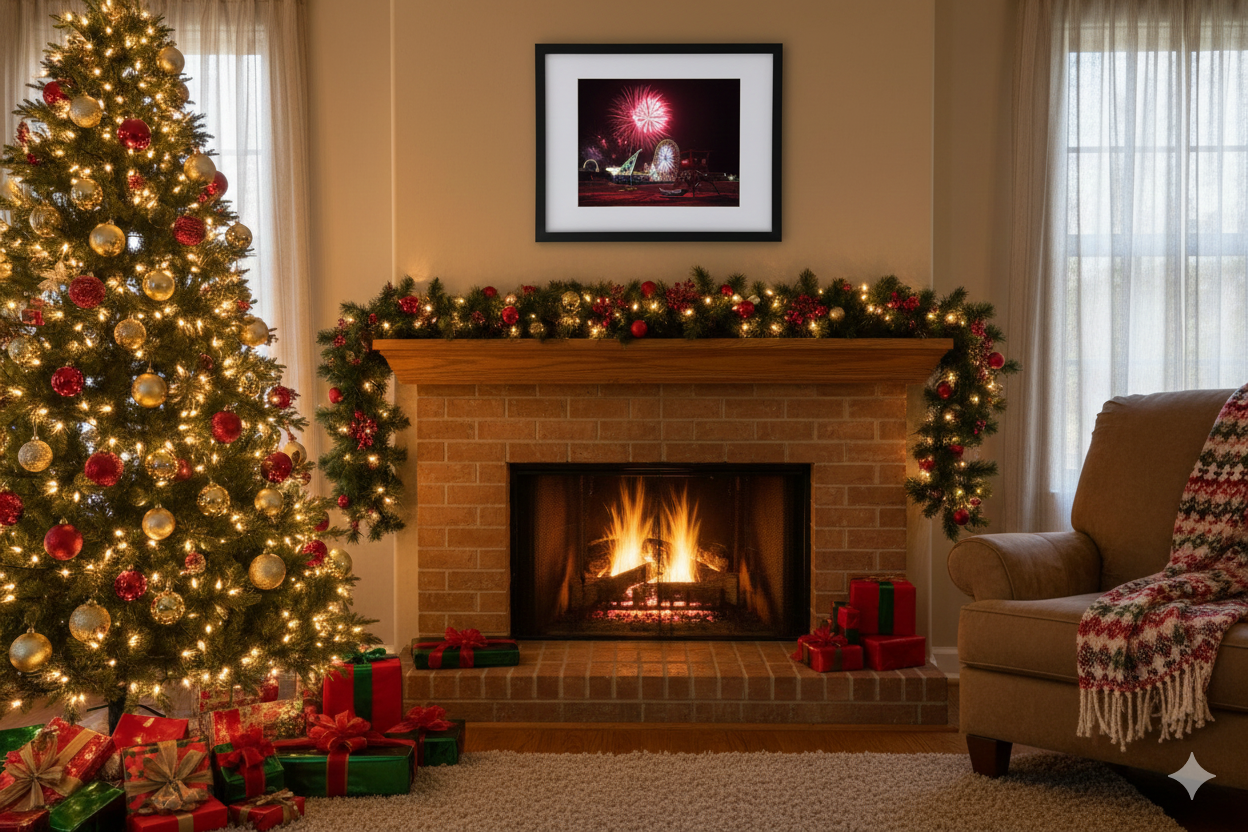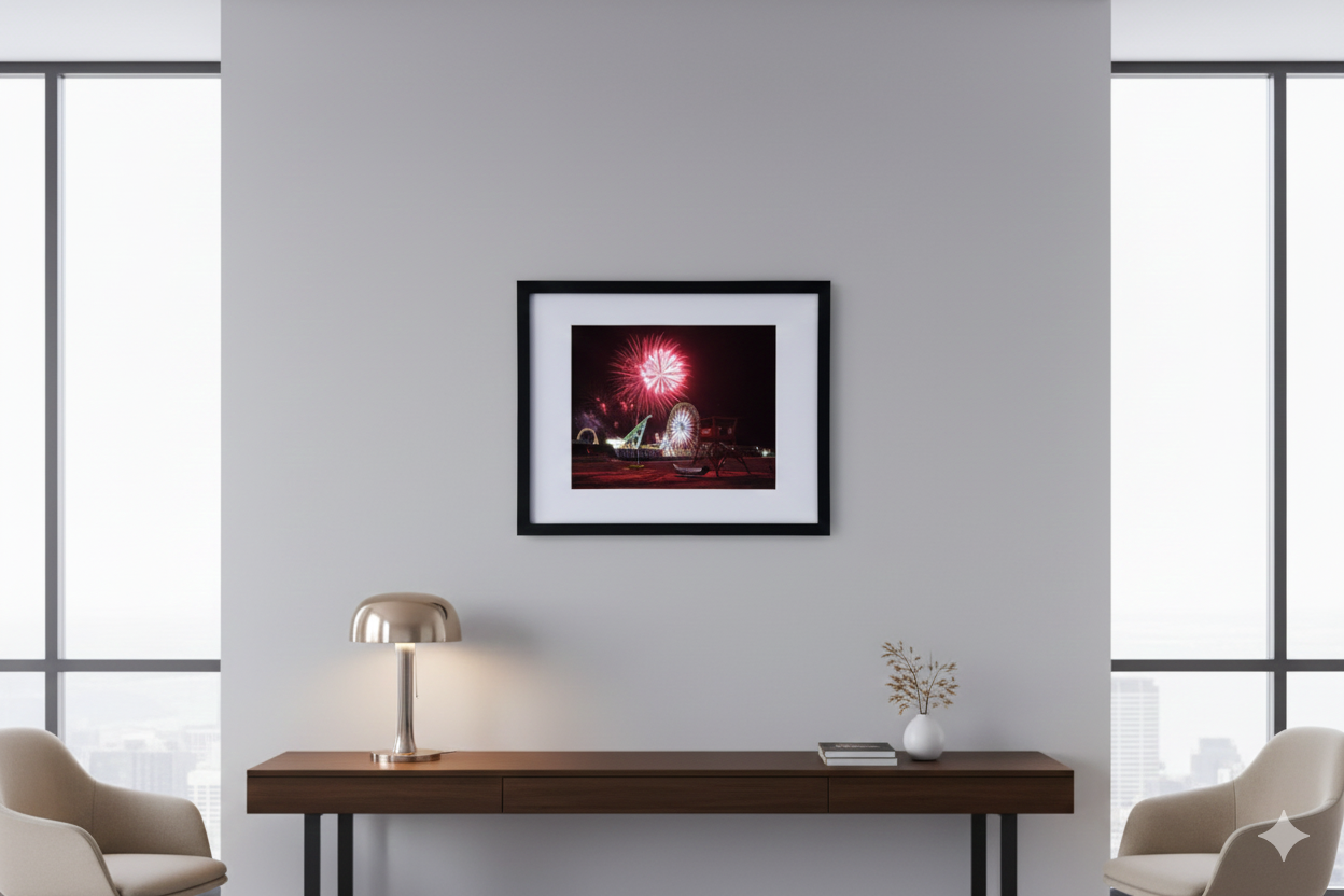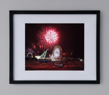 Celebrate the magic of Wildwood with these striking colors photographed by Tony Deutsch. Featuring vibrant fireworks bursting over the iconic Ferris wheel and roller coaster, alongside the timeless Wildwood Beach Patrol lifeguard boat, this piece captures the spirit of summer nights at the shore.