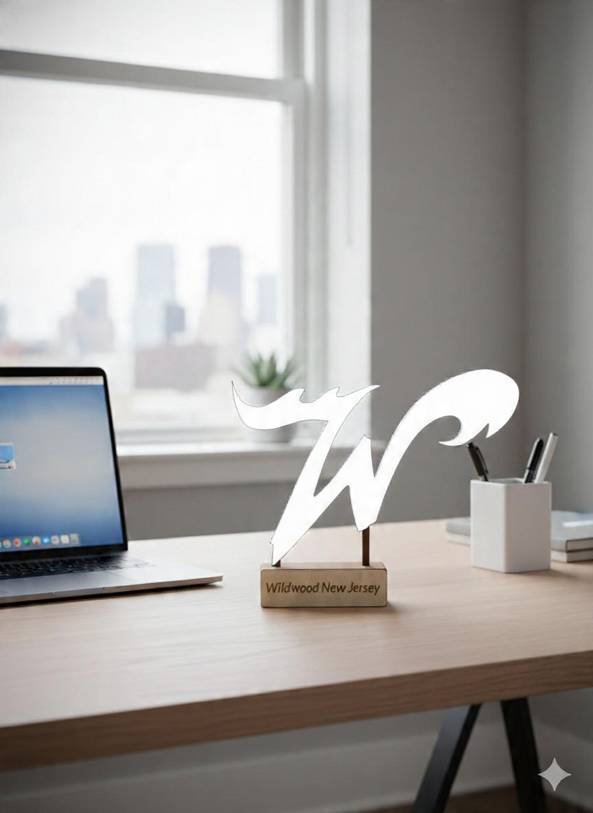 Celebrate your love for the shore with this handcrafted Wildwood NJ “W” desk display. The bold, stylized “W” is laser cut and mounted on a wooden base engraved with “Wildwood New Jersey” — perfect for desks, shelves, or gift giving.